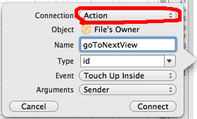 4. in the pop up window make sure you change Connection type Outlet to --> Action, and give method name as "goToNextView"